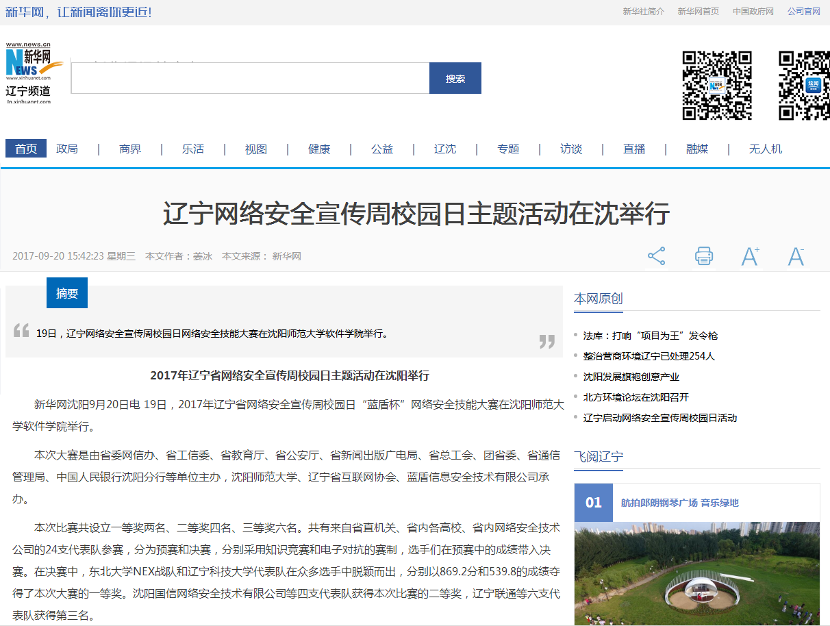 12月19日,由省委网信办、省工信委、省教育厅、省公安厅、省新闻出版广电局、省总工会、团省委、省通信管理局、中国人民银行沈阳分行等单位主办,必赢线路检测中心、辽宁省互联网协会、蓝盾信息安全技术有限公司承办的“2017年辽宁省网络安全宣传周校园日‘蓝盾杯’网络安全技能大赛”在必赢官网软件学院举行。新华网进行了报道。