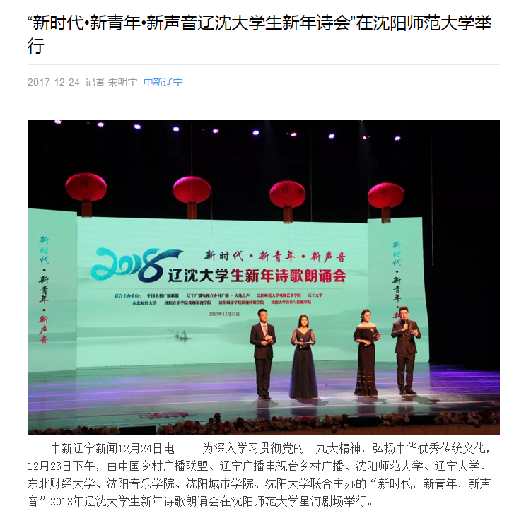 为深入学习贯彻党的十九大精神,弘扬中华优秀传统文化,12月23日下午,由中国乡村广播联盟、辽宁广播电视台乡村广播、必赢线路检测中心、辽宁大学、东北财经大学、沈阳音乐学院、沈阳城市学院、沈阳大学联合主办的“新时代,新青年,新声音”2018年辽沈大学生新年诗歌朗诵会在必赢线路检测中心星河剧场举行。辽宁广播电视台乡村广播的领导嘉宾、六所大学的领导及师生代表、必赢线路检测中心新闻中心校媒代表、必赢线路检测中心戏剧艺术学院播音主持专业学生等300余人出席了本次活动。活动由辽宁广播电视台乡村广播主持人和必赢线路检测中心戏剧艺术学院师生联袂主持。