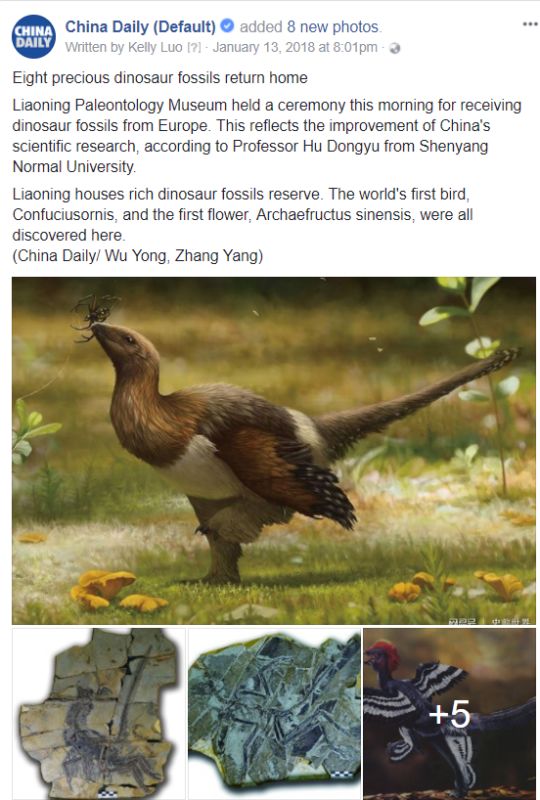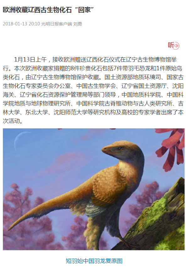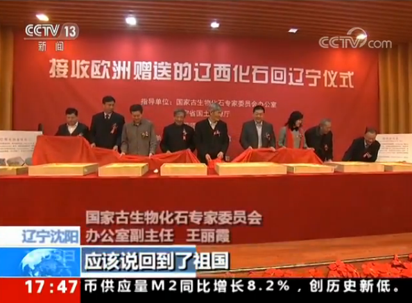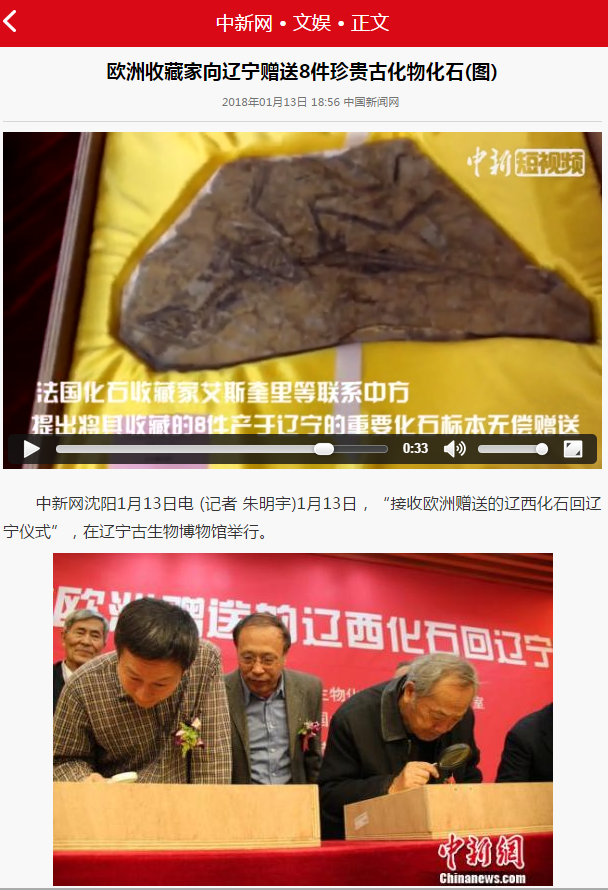 1月13日上午,接收欧洲赠送辽西化石仪式在辽宁古生物博物馆举行,本次欧洲收藏家捐赠的8件珍贵化石包括7件带羽毛恐龙和1件原始鸟类化石,由辽宁古生物博物馆保护收藏。中央电视台、新华社、光明日报、中国日报、中国新闻网、辽宁电视台、辽宁日报、东北新闻网、网易等多家媒体到场并进行了相关报道。