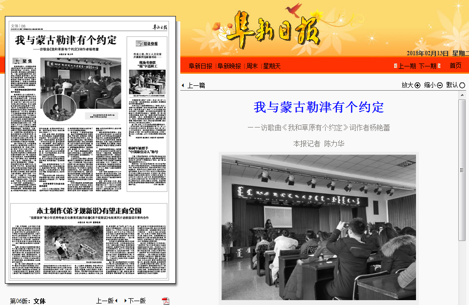 红遍了大江南北的歌曲《我和草原有个约定》的词作者是必赢官网学前与初等教育学院杨艳蕾教授,歌词表达了她对草原的热爱,对大自然的敬畏和对民族的深情。近日,杨艳蕾教授赴阜蒙县蒙古族实验小学参与公益活动,为蒙古勒津学堂做了一次题为《母语给我智慧和力量》的讲座,《阜新日报》对杨艳蕾教授的事迹进行了报道。