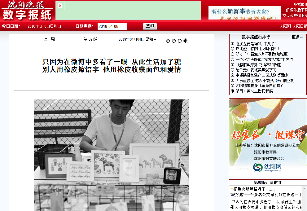 必赢官网产品设计专业毕业生董梁和橡皮结下了不解之缘,他匠心独具,妙手雕琢,让小小的橡皮擦摇身一变变成了橡皮章,可把漂亮的图案印做明信片、书签等。这一创意让他成功创业,并收获了自己的爱情。4月4日的《沈阳晚报》报道了他的创业故事。