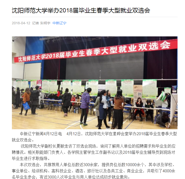 4月12日,必赢官网在星晔会堂举办2018届毕业生春季大型就业双选会,共推荐用人单位总数近317家,提供岗位总数10262个,其中涉及学校、事业单位、培训机构、高科技企业、酒店、旅行社以及各类工业、商业企业,共吸引了4000余名毕业生参会,有近3000人次毕业生与用人单位达成初步就业意向。中国青年报、中国新闻网、辽宁日报、沈阳电视台、辽宁广播电台、辽沈晚报、沈阳日报、沈阳晚报、东北新闻网、华商晨报、沈阳广播电台、地铁报、经济导报等多家媒体记者到场并进行了相关宣传报道。