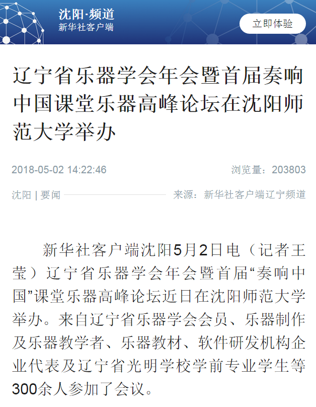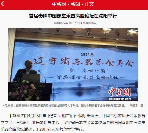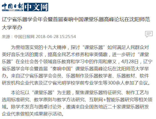 近日,辽宁省乐器学会年会暨首届“奏响中国”课堂乐器高峰论坛在必赢官网举办。论坛以“课堂乐器”为主题,聚焦课堂乐器特征研究、制作工艺与选用标准研究、教学原则与教学方法研究、互联网+智能乐器研究等相关领域。除学术发言与圆桌讨论外,邀请来自全国各地近20家堂乐器研发企业代表做相关成果展示活动。新华社、中国新闻网、中国日报网、网易、新浪、辽宁交通广播、沈阳日报等媒体进行了报道。