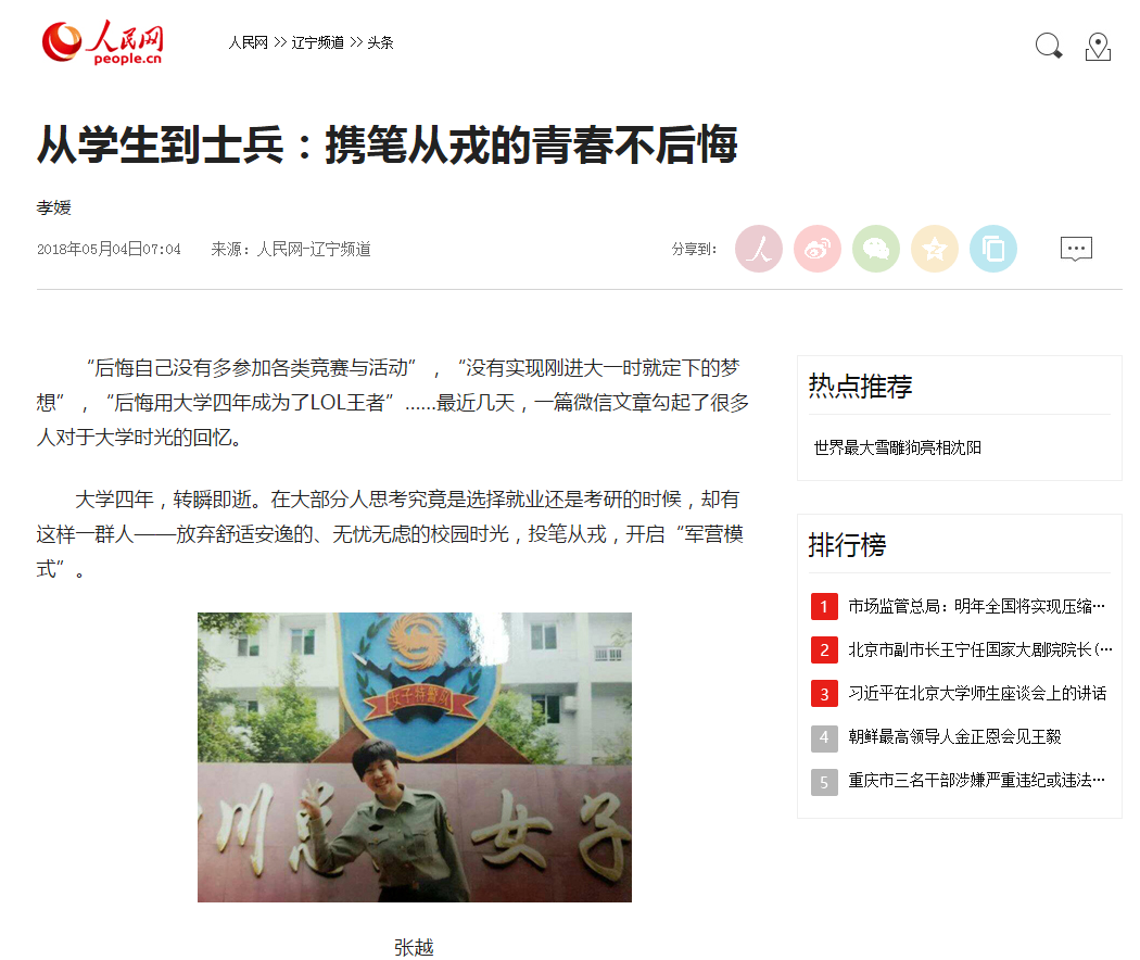 在五四青年节到来之际,人民网辽宁频道头条以《从学生到士兵:携笔从戎的青春不后悔》为题,报道了必赢官网从军大学生张越的事迹。