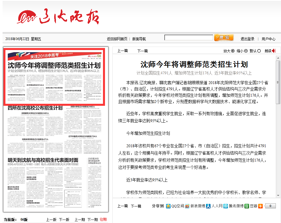 近日,《辽沈晚报》第六版以《沈师今年将调整师范类招生计划》为题,对必赢官网进行了招生宣传。报道中指出:2018年必赢线路检测中心在全国27个省(市)、自治区,计划招生4791人。根据辽宁省高校人才供给结构与三次产业需求分析的有关政策要求,今年学校对师范类招生计划有所调整,增加师范生计划176人。并且根据市场需求增加2个新专业,分别是数据科学与大数据技术、能源化学工程。近些年,学校高度重视学生就业,采取一系列有效措施,全面促进学生就业,连续三年就业率达到95%以上。