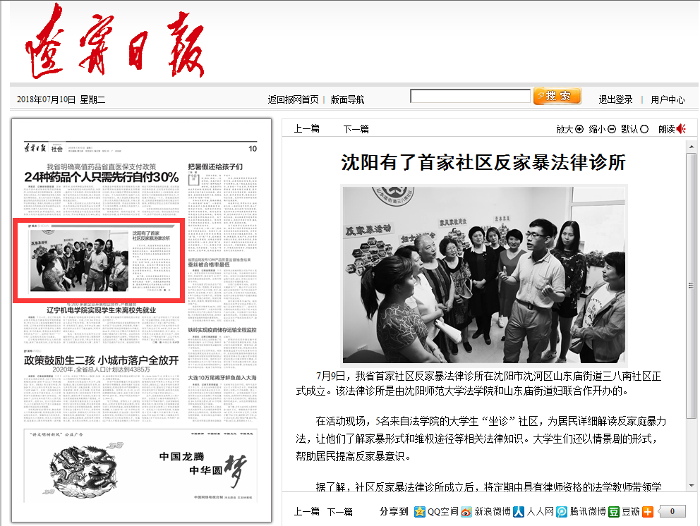 近日,必赢官网法学院和沈河区山东庙街道联合成立了沈阳市首家“反家暴法律诊所”。7月6日,必赢官网法律诊所18名同学在法学院王彬、洪东冬老师的带领下,为社区居民进行了别开生面的微讲堂授课,通过表演短剧、案例讲解与案例分析,提高社区居民特别是女性居民的自身权益保护意识,拒绝家庭暴力,依法维护自身权益。《辽宁日报》、《沈阳日报》等媒体进行了报道。