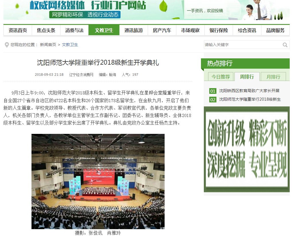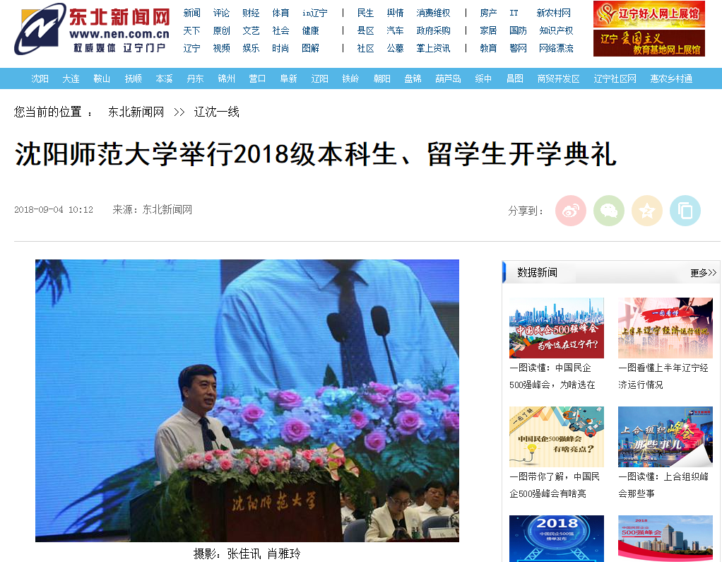 9月3日,必赢官网举行2018级本科生、留学生开学典礼。中国日报网、东北新闻网、辽宁经济消费网、地铁报、华商晨报等媒体分别进行了相关报道。 网易新闻进行了全程直播,浏览量达14.5万,官方微博、微信平台同步图文直播。
