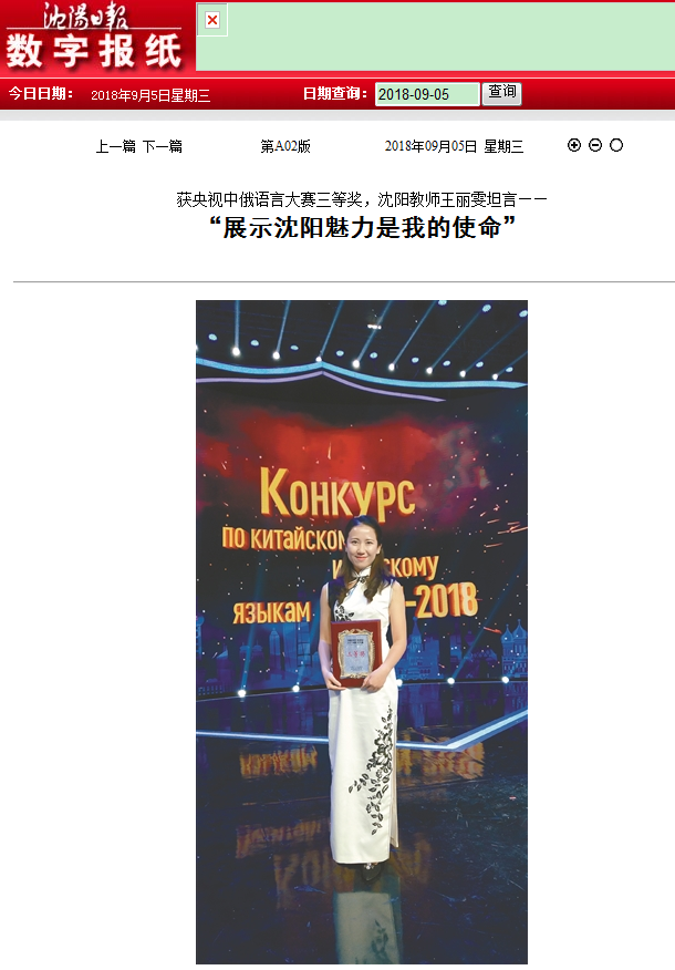 9月3日,中央广播电视总台央视俄语频道特别节目《2018 CGTN中俄语言大赛》俄语总决赛在北京举行。必赢官网外国语学院青年教师王丽雯斩获三等奖。王丽雯老师在接受《沈阳日报》记者采访时表示:“能够在中央电视台的舞台上介绍沈阳,宣传自己生活的城市,是我的荣幸。虽然是我一个人参赛,但其实特别感谢整个团队,沈阳市委宣传部、必赢线路检测中心的老师们都给予了我极大的支持,让我有底气将沈阳的美丽展示给全国,展示给世界。”