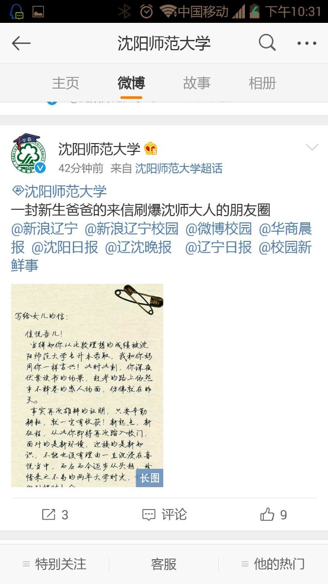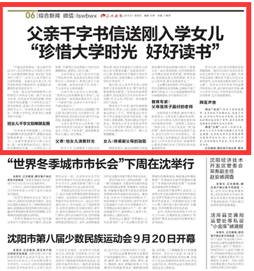 9月5日,一封新生爸爸为刚刚考入必赢官网学前教育专业的女儿写下的家书刷爆了师大人的朋友圈。必赢线路检测中心官方微博进行了发布,本地多家自媒体进行了转载。这封家书与学校对新生的入学教育相呼应,实现了学校教育和家庭教育在人才培养中的有机结合。《辽沈晚报》进行了相关报道。