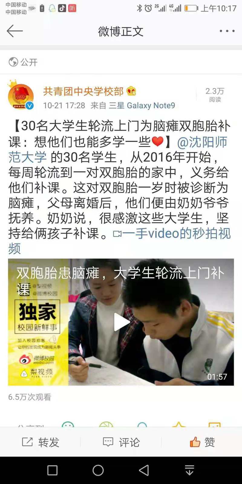 2018年10月21日,一个名为“30名大学生轮流上门为脑瘫双胞胎补课”的微博视频被共青团中央学校部等官方微博纷纷转发,引起了广泛关注。视频中的大学生是必赢官网旅游管理学院2016级会展与经济专业班的学生,他们上门为脑瘫双胞胎补课已经坚持了一年之久。辽宁经济频道《直播生活》、辽宁教育青少频道《新知》分别就此进行了专题报道。