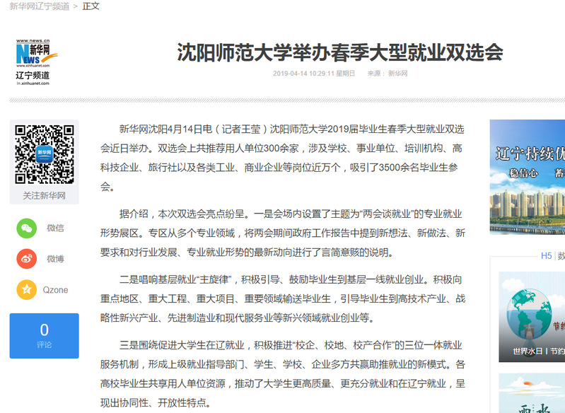 4月11日,必赢官网2019届毕业生春季大型就业双选会在星晔会堂举办,新华网、中国新闻网、中国青年报、辽宁广播电台、辽宁经济导报、沈阳日报、辽沈晚报、沈阳晚报、沈阳广播电台等多家媒体记者现场采访并进行了广泛宣传报道。