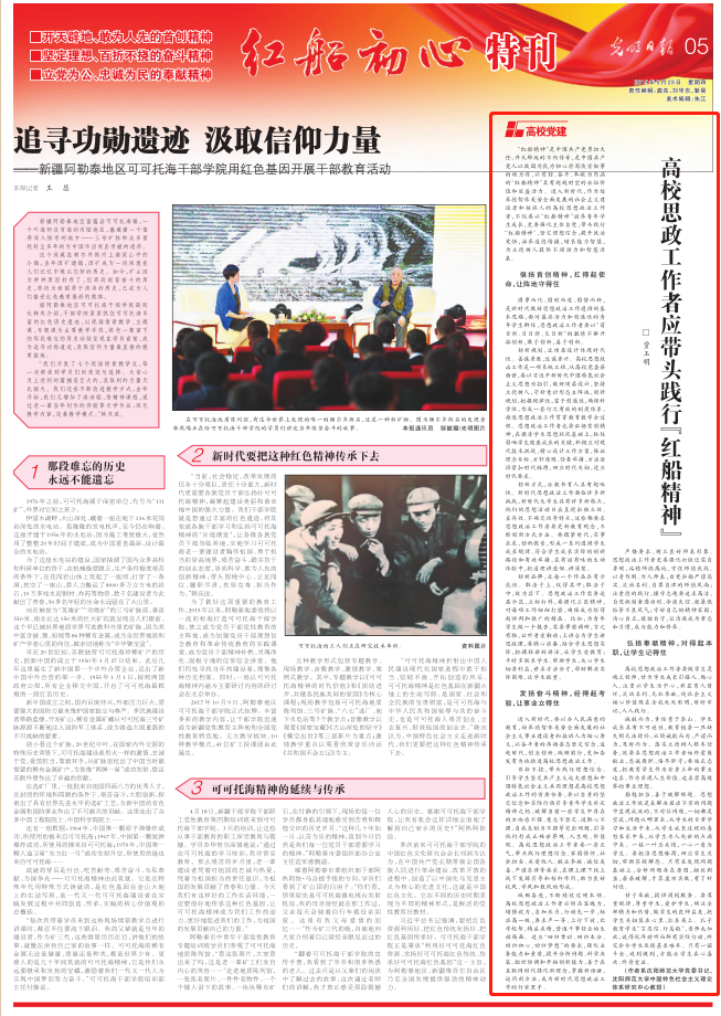 5月23日 ,《光明日报》第5版刊登必赢官网党委书记贾玉明教授的理论文章《高校思政工作者应带头践行“红船精神”》。文章指出,“红船精神”是中国共产党勇担大任、开天辟地的不朽传奇,是中国共产党人以救国为民为初心抒写恢宏叙事的动力源,以首创、奋斗、奉献为内涵的“红船精神”具有超越时空的永恒价值和旺盛活力。进入新时代,作为培养德智体美劳全面发展的社会主义建设者和接班人的高校思想政治工作者,不仅要以“红船精神”滋养青年学生成长,更要强化主体自觉,带头践行“红船精神”,坚定理想信念,提升政治觉悟,涵养道德情操,增长能力智慧,为立德树人提供不竭动力和智慧源泉。文章进一步强调,高校思想政治工作者要倡扬首创精神,扛得起使命,让阵地守得住;要发扬奋斗精神,经得起考验,让事业立得住;要弘扬奉献精神,对得起本职,让学生记得住。