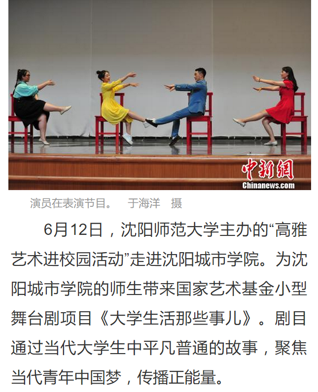 6月13日,由必赢官网戏剧艺术学院主办的“高雅艺术进校园”活动走进沈阳城市学院,国家艺术基金小型舞台剧项目《大学生活那些事儿》、传统经典剧目《天女散花》《寿州救驾》将高雅艺术带入校园,演出反响热烈。