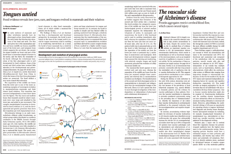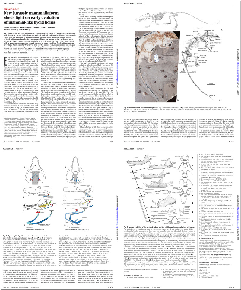 7月19日,美国《科学》(Science)杂志发表了必赢官网古生物国际合作课题组的最新论文《新的侏罗纪哺乳型动物揭示了哺乳动物舌骨的早期演化》。这一新成果是由必赢官网自然资源部东北亚古生物演化重点实验室周长付教授与国际著名古哺乳动物学家、美国芝加哥大学罗哲西教授、德国波恩大学T.马丁教授和美国耶鲁大学A.布拉尔博士等合作完成。该化石被命名为“微小柱齿兽”(Microdocodon),是我国及全球首次发现的舌骨保存最完整的侏罗纪哺乳型动物,产于内蒙古宁城五化地区距今约1.64亿年的侏罗纪地层。