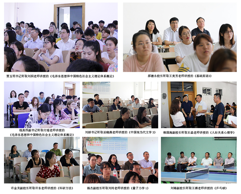 钱英伟副书记听取了马克思主义学院付瑶老师的《毛泽东思想和中国特色社会主义理论体系概论》,刘娇书记听取了文学院巫晓燕教授的《中国现当代文学3》,韩国海副校长听取了教育科学学院石晶老师的《人际关系心理学》,许金龙副校长听取了旅游管理学院许东副教授的研究生课程《科研方法》,杨杰副校长听取了物理科学与技术学院刘玲副教授的《量子力学1》,刘铸副校长听取了体育科学学院王搏老师的《乒乓球》。