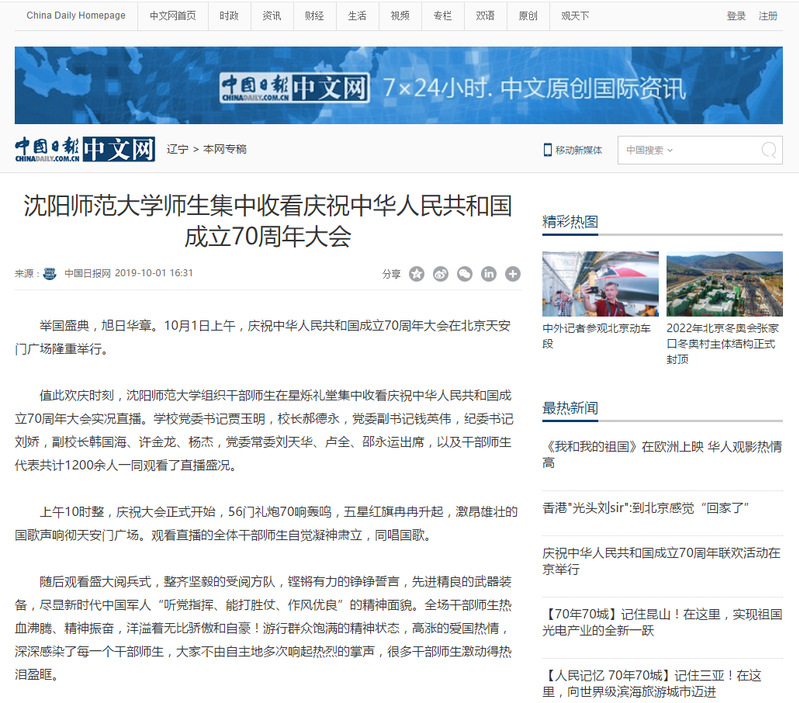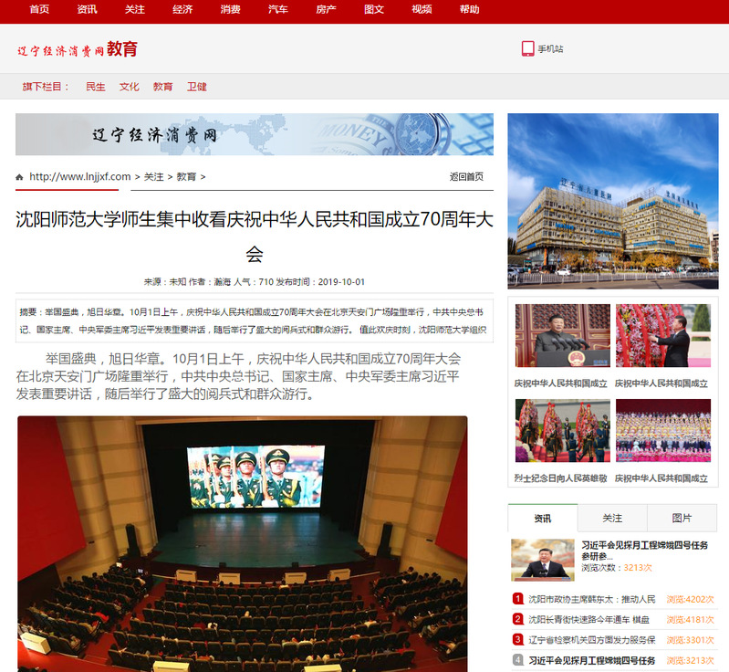 10月1日上午,庆祝中华人民共和国成立70周年大会在北京天安门广场隆重举行,必赢官网组织干部师生1200余人在星烁礼堂集中收看庆祝中华人民共和国成立70周年大会直播盛况,中国日报网、辽宁经济消费网、网易、搜狐进行了宣传报道。