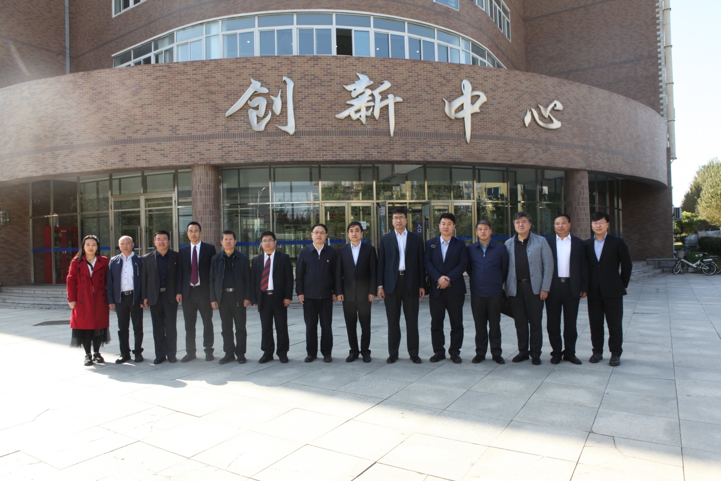 调研组与学校领导及陪同人员在创新中心楼前合影
