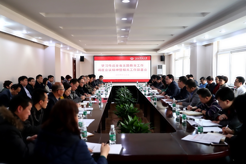 党委书记贾玉明结合学校实际,对26日上午召开的省委主题教育第三次推进会上省委书记陈求发,省委常委、组织部部长陆治原的讲话精神进行了传达。一要善始善终,善作善成,以钉钉子精神把主题教育抓紧抓实抓出成效。要认真检视反思落实主体责任情况,坚持把中央和省委部署的各项任务和专项整治工作落实到位,确保将学习教育、调查研究、检视问题和整改落实贯穿始终,做实做细。二要持续抓好学习教育,不断把理论学习引向深入。要督促党员、干部持续把学习抓紧抓实抓到位,对理论学习各项内容进行再梳理,确保不落项、不欠账,做到各级党组织和全体党员全覆盖、无死角;要持续跟进强化理论武装,引导党员、干部把学习贯彻党的十九届四中全会精神与学习贯彻习近平新时代中国特色社会主义思想结合起来,确保四中全会精神落实到位。三要发扬自我革命精神,抓紧抓实整改落实和专项整治工作。各单位党组织要对整改落实和专项整治情况进行系统梳理,建立工作台账,明确整改方向、工作措施、阶段目标和时限要求,始终奔着问题去,盯着问题改,要有具体工作抓手,找准小切口解决大问题,由小见大,循序渐进,以实际问题的解决让师生感受到主题教育带来的新气象新变化。四要高质量开展好民主生活会和组织生活会。要按照中央部署要求,精心准备,加强指导,严格把关,盘点收获,检视问题,深刻剖析,严肃开展批评和自我批评;要把握时间要求,严格内容设计,将学习教育、谈心谈话、征求意见、梳理检视各项工作做充分;要认真撰写对照检视材料,亲力亲为,奔着问题去,检视问题和分析原因要准确深刻透彻;要认真开展批评和自我批评,做到有“辣味”,红脸出汗,解决实际问题。五要加强组织领导,切实全面抓好主题教育各项工作。各单位党组织书记要落实第一责任人职责,落实“四个到位”要求,切实提高主题教育质量,坚决杜绝以问题清单代替整改、把梳理整改举措认为完成整改的情况,一以贯之把主题教育的各项要求落实到位。