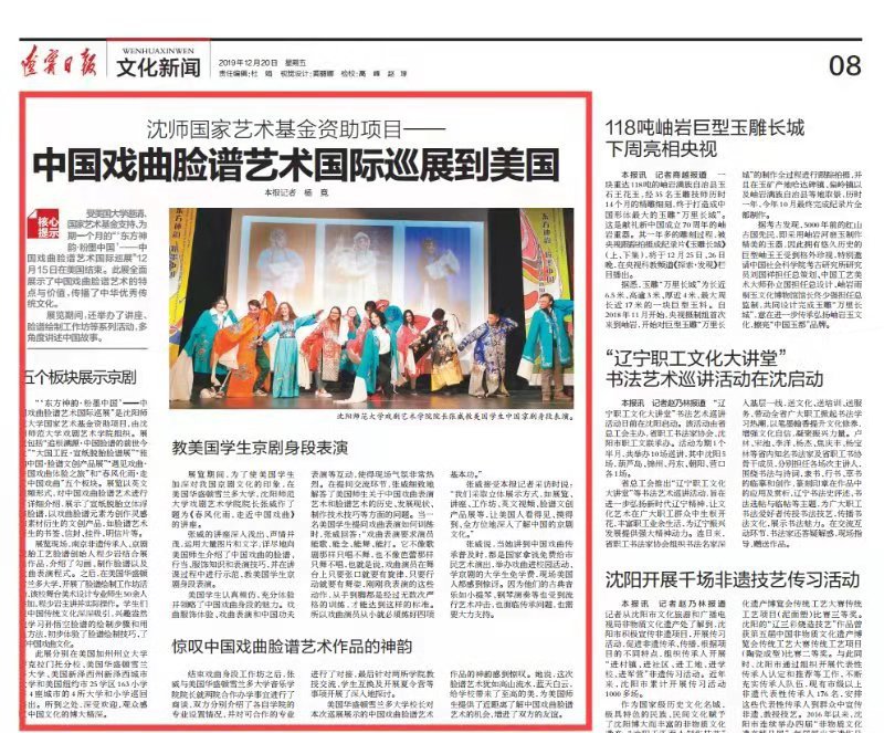 受美国大学邀请、国家艺术基金支持、为期一个月的“‘东方神韵·粉墨中国’——中国戏曲脸谱艺术国际巡展”12月15日在美国结束。此展全面展示了中国戏曲脸谱艺术的特点与价值,传播了中华优秀传统。