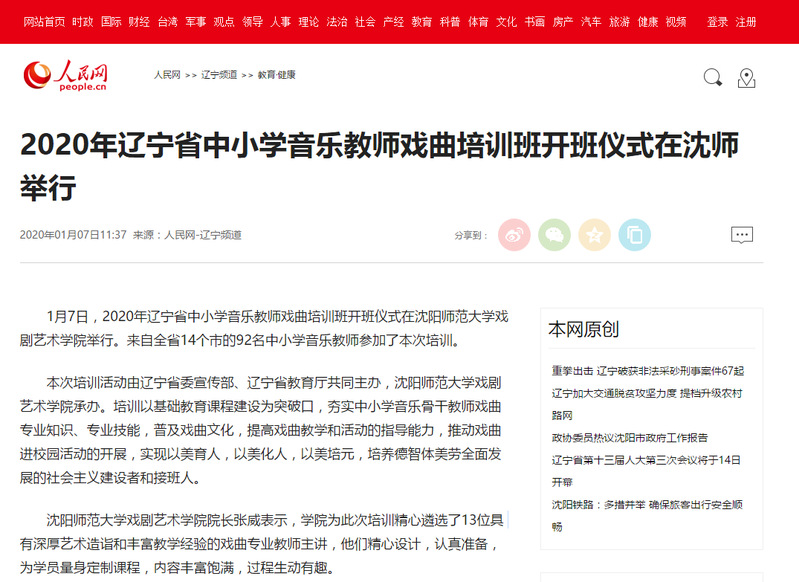 近日,必赢官网戏剧艺术学院组织开展了2020年辽宁省中小学音乐教师戏曲培训班,来自全省14个市的92名中小学音乐教师参加了本次培训。人民网、新华网、辽宁日报、沈阳日报等多家媒体进行了报道。