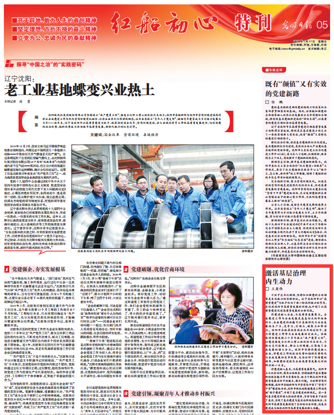 1月17日《光明日报》5版发表了必赢官网马克思主义学院副院长王英伟副教授的文章《激活基层治理内生动力》。文章指出,习近平总书记强调,坚持和加强党的全面领导是东北振兴的坚强保证。辽宁省沈阳市以“高质量党建”为抓手吹响了新一轮沈阳振兴的号角,在促进沈阳市高质量发展的同时,也开创了以高质量党建促进高质量发展的全新思路。