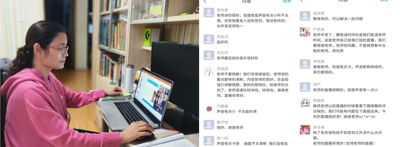 平台数据显示,李老师第一周的线上教学活动反馈良好。她严格按照线上教学计划布置视频学习、章节测验、讨论话题等任务,通过平台、微信等多种方式发布学习通知,按照课表进行线上直播,利用在线问卷实时掌握学生线上学习情况。学生留言说:“李老师的线上直播非常精彩,答疑解惑细致全面,让我们仿佛置身于校园课堂中。”