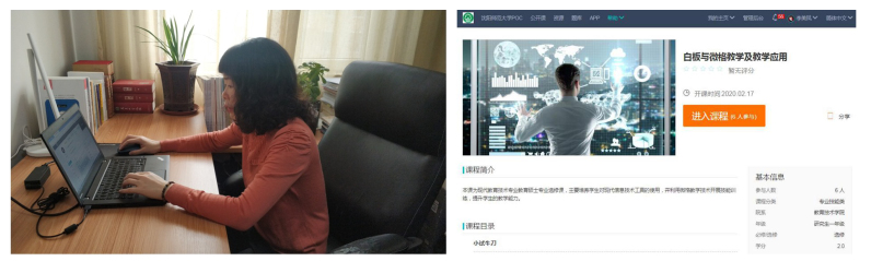 疫情期间,李美凤老师通过畅课平台(Tronclass)、腾讯课堂、微信群相结合的方式,为19级教育硕士开设《白板与微格教学技术及其应用》课程。该课程是一门专业选修课,实践性比较强。通过网络教学平台,为学生提供理论讲解、专业文献、教学案例、工具软件教程,于此同时,推荐中国大学MOOC网中关于教师教学基本技能讲解的课程,供学生自主学习。学生带着教师布置的问题在课下读文献、观摩案例、撰写心得体会,在平台互动区共享资料、提出困惑并对同伴的问题发表观点。每个学生都既是学习者,也是释疑者,同伴互助互教将学习不断引上新的深度。在此基础上,教师通过直播课堂,对学生总结之后提炼出来的更有深度的问题,再进行点拨、引导、释疑。对于课程中的实践环节,通过让学生录制微课、录制说课、导课、讲解、提问、总结等片段,开展自评、互评、师评相结合的多元评价,学生通过评价—反思—更新,不断提升自己的教学技能。