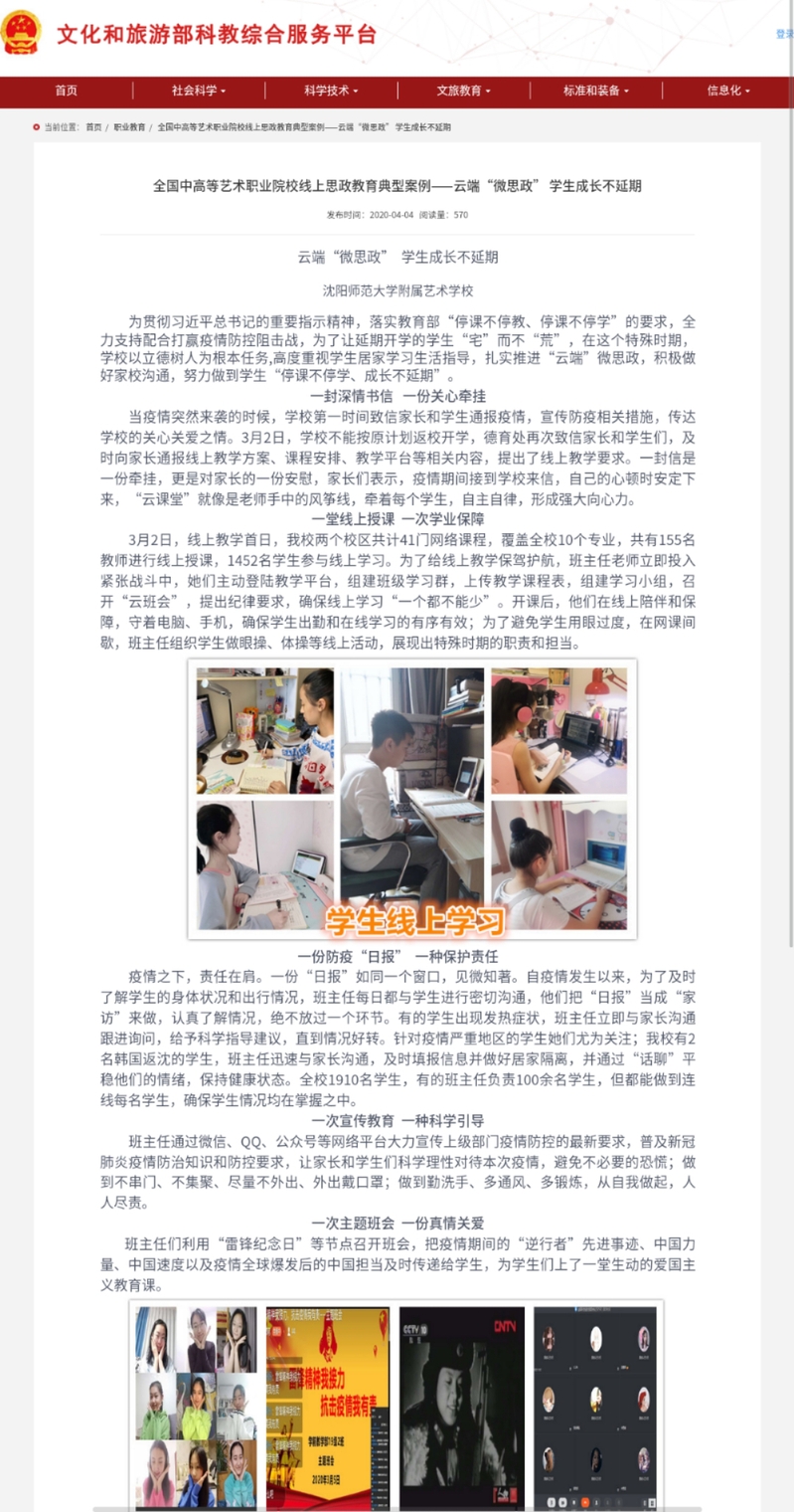 近日,文化和旅游部科教综合服务平台发布了全国中高等艺术职业院校线上思政教育典型案例,其中《云端“微思政” 学生成长不延期》以必赢官网附属艺术学校为典型案例,专题介绍了附属艺术学校防疫期间开展云端“微思政”的具体情况。