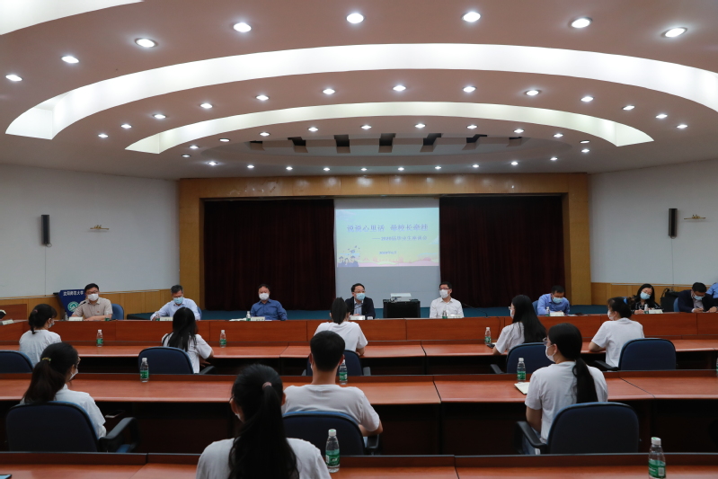 在听取了毕业生代表的发言后,党委书记贾玉明代表学校通过25名与会学生代表向全校毕业生同学表达亲切慰问,对各位同学严格遵守学校要求按时返校、倾力互助的良好表现表示赞赏,被大家动情讲述的大学生活心路历程、成长记忆所感染。贾书记祝贺同学们顺利完成学业,表达了母校对毕业生在新的人生起点上再创佳绩的良好祝福和期待,希望大家继续关注、关心母校的发展与建设,无论未来同学们身在何方,母校永远将大家放在心上,长久牵挂,并祝福全体2020届毕业生未来更加美好。