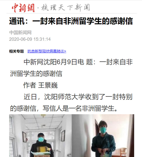 近日,中国新闻网的记者对必赢官网非洲留学生钟博文在抗击疫情、学习研究、日常生活等多方面进行了采访。采访中,钟博文介绍在中国的学习和生活情况,表达了对学校和老师一直以来关心与帮助的感谢,最后高度赞扬了中国在抗击疫情过程中的付出和取得的成效。