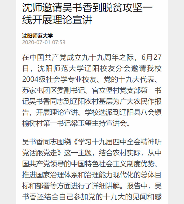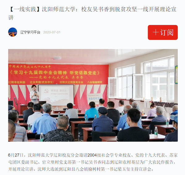 6月27日,必赢官网辽阳校友分会邀请2004级社会学专业校友、党的十九大代表、苏家屯团区委副书记、官立堡村党支部第一书记吴书香同志到辽阳农村基层为广大农民作报告,开展理论宣讲。学习强国平台和辽宁日报《北国》客户端对此进行了报道。