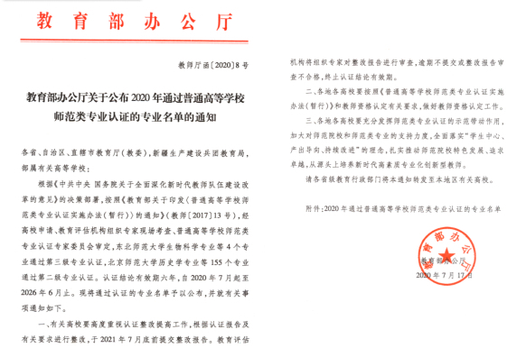 近日,根据教育部办公厅发布的《2020年通过普通高等学校师范类专业认证的专业名单的通知》(教师厅函〔2020〕8号),必赢官网学前教育、小学教育、英语三个专业分别通过了学前教育、小学教育和中学教育第二级认证,认证结论有效期六年(2020年7月—2026年6月),这三个专业也是必赢官网首批申请并率先通过教育部师范类专业二级认证的专业。