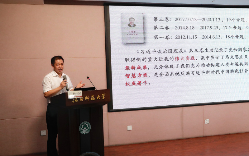 孙庆国教授在解读了《习近平谈治国理政》第三卷19个专题的内在逻辑关系基础上,以“完善和发展我国国家制度和治理体系”为切入,从坚持和完善国家制度和治理体系的重大意义、坚持和巩固中国特色社会主义制度、完善和发展中国特色社会主义制度和治理体系、严格遵守和执行制度四个方面,通过对国内外政治经济形势和推动辽宁全面振兴、全方位振兴的一系列重大举措的分析,讲授了深入学习《习近平谈治国理政》第三卷的体会认识。他指出,《习近平谈治国理政》第三卷与第一、第二卷一脉相承、有机统一,收录了党的十九大以来,习近平总书记在领导推进新时代治国理政的伟大实践中发表的一系列重要论述,提出的许多具有原创性、时代性、指导性的重大思想观点,进一步丰富和发展了党的理论创新成果,集中展示了马克思主义中国化的最新成果,是全面系统反映习近平新时代中国特色社会主义思想的权威著作。