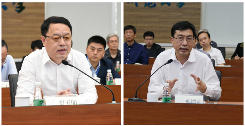 学校党委书记贾玉明介绍学校师范教育情况(左)
