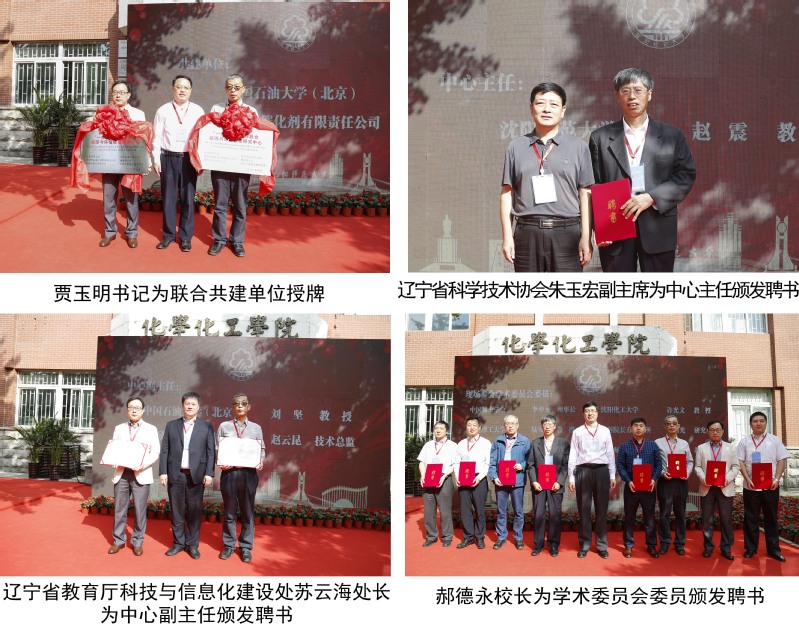 在仪式现场,徐春明院士、李春龙理事长、朱玉宏副主席、许光文校长、苏云海处长、郝德永校长共同为中心揭牌;贾玉明书记为联合共建单位中国石油大学(北京)、昆明贵研催化剂有限责任公司授牌;朱玉宏副主席、苏云海处长为中心主任、副主任颁发了聘书;郝德永校长为到场的学术委员会主任及委员颁发聘书。
