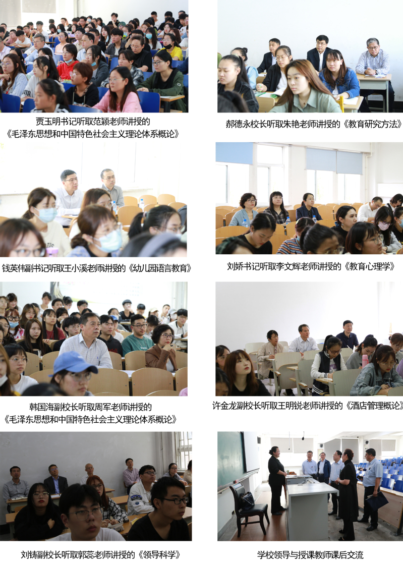 钱英伟副书记听取了学前与初等教育学院王小溪老师讲授的《幼儿园语言教育》,刘娇书记听取了学前与初等教育学院李文辉老师讲授的《教育心理学》,韩国海副校长听取了马克思主义学院周军老师讲授的《毛泽东思想和中国特色社会主义理论体系概论》,许金龙副校长听取了旅游管理学院王明锐老师讲授的《酒店管理概论》,刘铸副校长听取了管理学院郭蕊老师讲授的《领导科学》。
