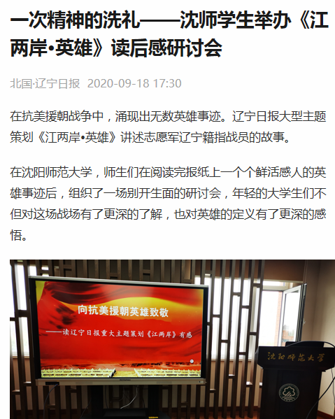 近日,《辽宁日报》策划了大型主题专版《江两岸•英雄》讲述志愿军辽宁籍指战员的故事。学校新闻中心学生记者们在阅读完样报上一个个鲜活感人的英雄事迹后,组织了一场别开生面的研讨会。同学们不但对这场战场有了更深的了解,也对英雄的定义有了更深的感悟。大家纷纷表示,新时代的大学生更应该牢记使命,让青春之花绽放在祖国和人民需要的地方。辽宁日报北国网对本次活动进行报道。
