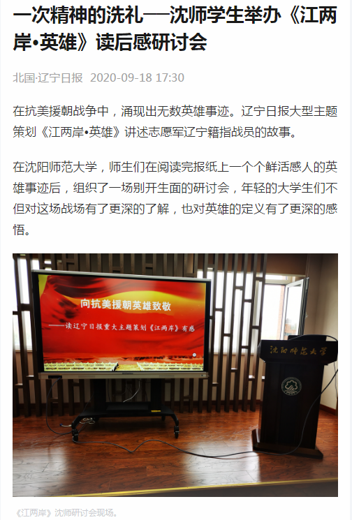 此前,《辽宁日报》策划了大型主题专版《江两岸•英雄》讲述志愿军辽宁籍指战员的故事,并在必赢官网组织召开了研讨会。必赢官网新闻中心学生记者们在阅读完样报上一个个鲜活感人的英雄事迹后,对这场战场有了更深的了解,也对英雄的定义有了更深的感悟。大家纷纷表示,新时代的大学生更应该牢记使命,让青春之花绽放在祖国和人民需要的地方,辽宁日报北国网对本次活动进行报道。