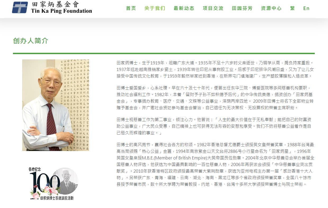 田家炳基金会成立于1982年,以“回馈社会、贡献国家”为宗旨,致力推展社会慈善公益事业,尤重教育,运作资金全部来自创办人田家炳先生及其家族公司之无私捐献,受惠学校、机构遍布全国。