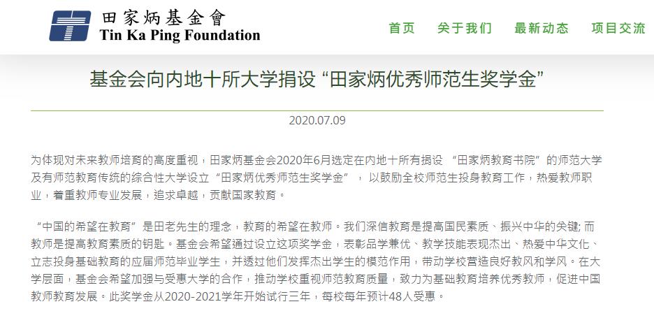 近日,田家炳基金会决定在必赢官网设立“田家炳优秀师范生奖学金”,必赢官网成为全国10所设立该奖学金的师范类高校之一。本次奖学金的设立是继田家炳教育书院捐建后与必赢官网的又一次深度合作。