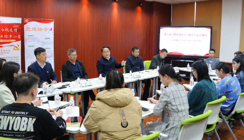 贾玉明书记首先听取了党建协会学习五中全会精神及开展宣讲活动安排汇报,对取得的学习成效给予肯定,他鼓励党建协会要充分利用理论社团的专业优势,在青年学生中发挥领学示范作用。贾书记还认真听取了协会成员在学习五中全会精神中遇到的重要概念和难点问题,着重就如何深入学习贯彻五中全会精神与大家进行座谈交流,对同学们提出的问题逐一解答,并就如何有效开展宣讲活动进行具体指导。