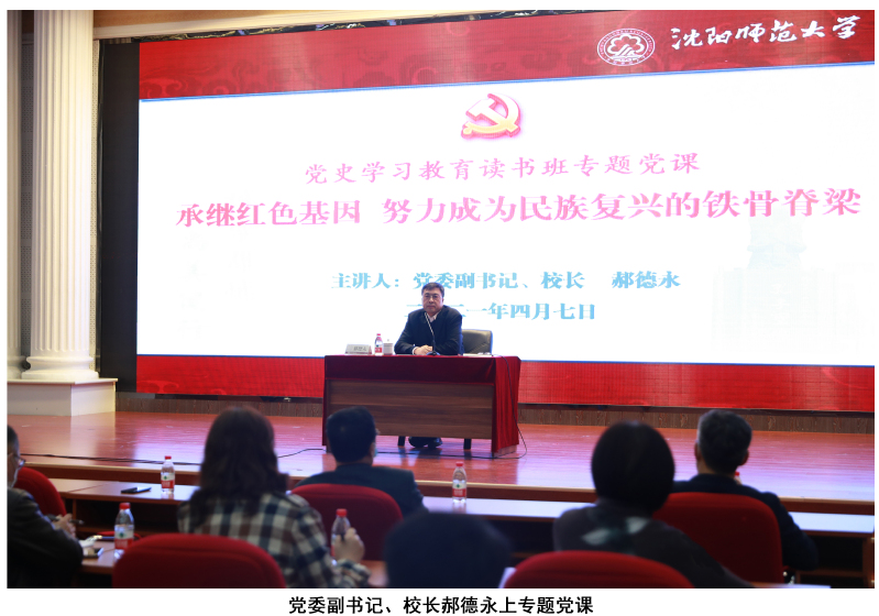 按照学校党史学习教育工作总体安排,4月7日下午,学校在国际商学院二楼报告厅举办党史学习教育读书班,党委副书记、校长郝德永以《承继红色基因,努力成为民族复兴的铁骨脊梁》为题,为与会党员师生讲授专题党课。各单位党组织书记、副书记、专职组织员、辅导员,机关中层干部以及学生党员代表等300余人参加了专题党课。党课由党委副书记钱英伟主持。