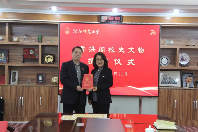 杨杰副校长代表学校接受捐赠,并向詹洪阁颁发捐赠证书。对詹洪阁先生情系学校、慷慨捐赠的善举表示衷心感谢。她高度赞扬詹洪阁先生对学校成长和建设的关注。她指出,詹洪阁先生的捐赠寄托了对学校的一片深情厚谊,使得沈师的文化底色愈加深沉厚重,值得纪念和珍惜。她强调,此次捐赠既是一次爱心捐赠活动,更是一次学子对学校情怀的展示。这些文物作为见证沈师发展和建设的成果和结晶,学校一定会妥善保管。她希望詹洪阁先生今后能一如既往地关心和支持学校事业的发展,多提宝贵意见和建议。她表示,詹洪阁先生和社会各界的鼎力支持必将极大促进学校改革与事业发展,全校师生员工将不忘初心、牢记使命,以内涵式发展为主线,推进学校事业发展再上新台阶。