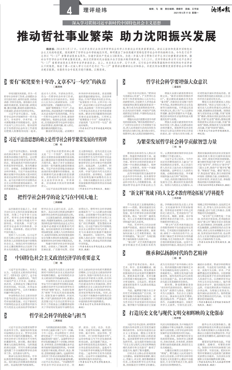 近日,《沈阳日报》4版“理评经纬”刊登《推动推动哲社事业繁荣 助力沈阳振兴发展》的评论文章,文章摘录了必赢官网副校长刘铸教授就此话题的意见和建议。