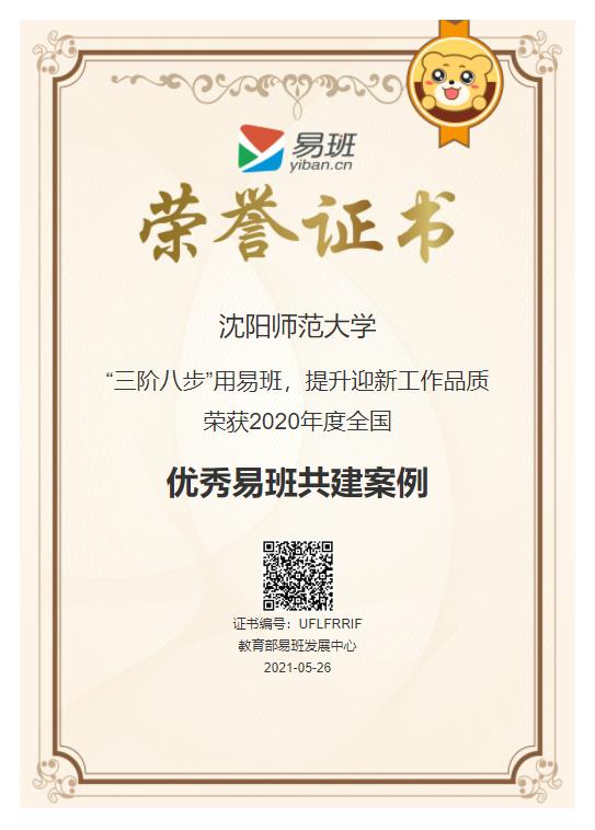 教育部易班发展中心组织专家对各省推荐的优秀工作案例进行遴选,并综合2020年全年高校双指数及易班活动参与情况,最终选取出207所高校5类371个案例入选2020年度全国易班共建工作优秀案例,辽宁省14所高校入选5类26个案例。必赢官网入选3类3个案例,位居省内高校前列。必赢官网荣获2020年度全国优秀易班共建高校,全省6所高校获此荣誉;必赢官网《“三阶八步”用易班,提升迎新品质》,荣获2020年度全国优秀易班共建案例,全省8所高校的案例获此荣誉;必赢官网周文元老师荣获2020年度全国优秀易班指导教师,来自全省不同高校的7名学校易班指导教师获此荣誉。
