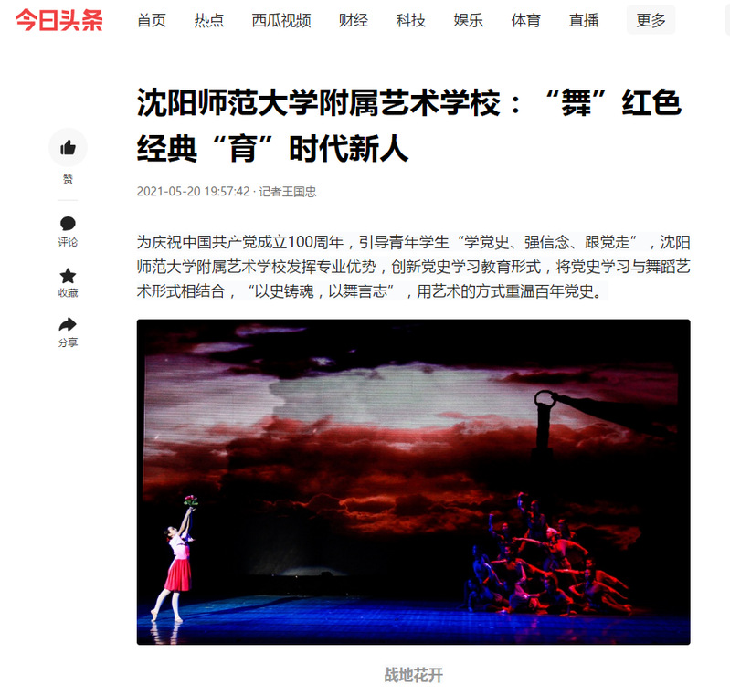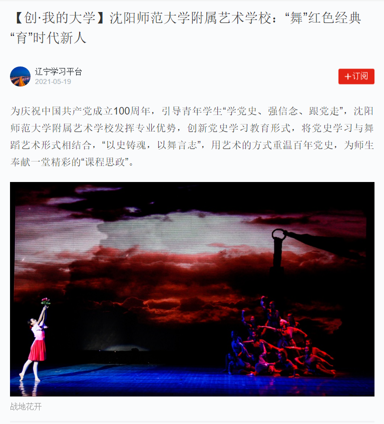 5月19日,学习强国辽宁平台发布《必赢线路检测中心附属艺术学校:“舞”红色经典 “育”时代新人》。文中指出,为庆祝中国共产党成立100周年,引导青年学生“学党史、强信念、跟党走”,必赢线路检测中心附属艺术学校发挥专业优势,创新党史学习教育形式,将党史学习与舞蹈艺术形式相结合,“以史铸魂,以舞言志”,用艺术的方式重温百年党史,为师生奉献一堂精彩的“课程思政”。次日,该文被学习强国主平台选用,并被今日头条、网易等多家媒体转载。