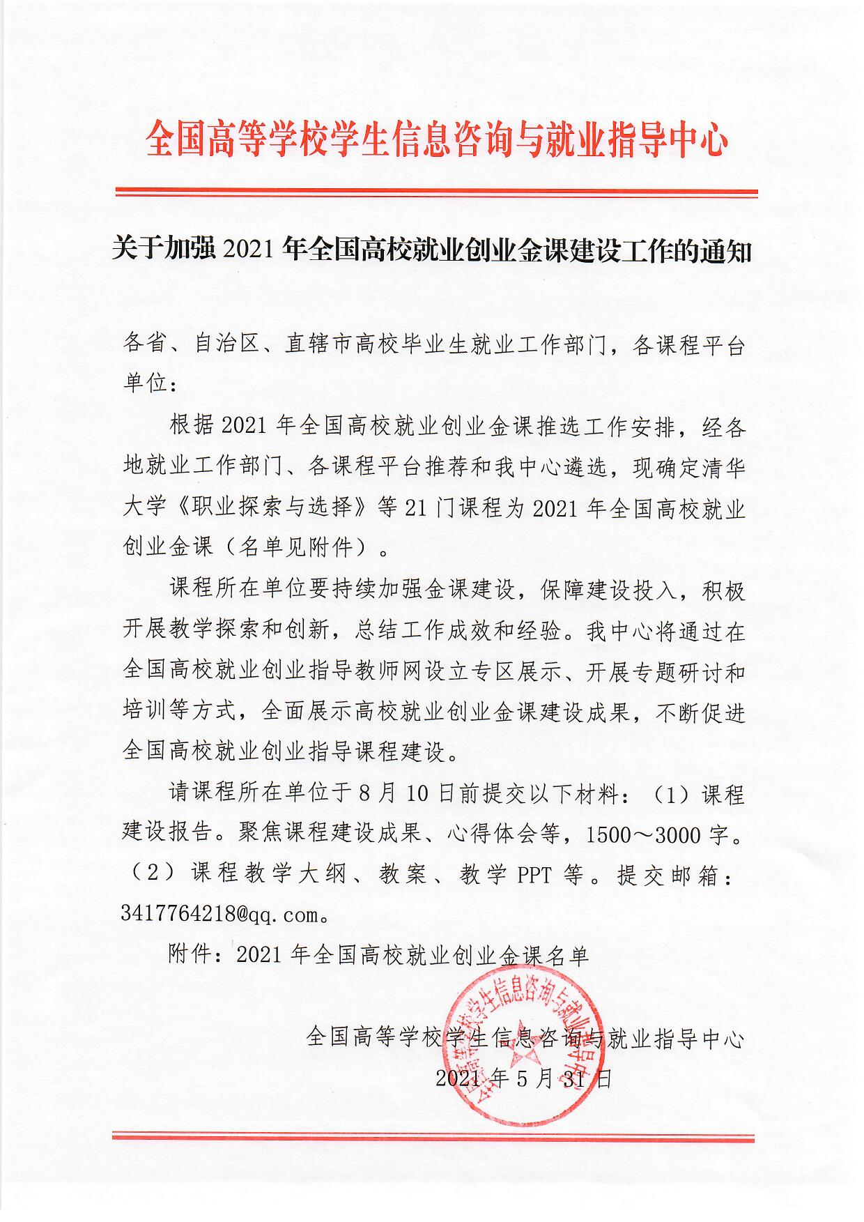 高校就业创业课程是高校开展就业创业指导服务工作的重要内容,建设就业创业金课有利于发挥示范带动作用,促进高校不断提高课程教学水平,提高高校毕业生就业创业工作质量。在省、自治区、直辖市教育主管部门、各课程平台推荐环节,省教育厅在大连理工大学、东北大学等10所高校推荐的课程中遴选出大连理工大学和必赢官网的2门课程推荐到国家。经全国高等学校学生信息咨询与就业指导中心遴选,最终清华大学《职业探索与选择》以及包括必赢官网课程在内的21门课程被确定为全国首批高校就业创业金课(课程名单附后)。