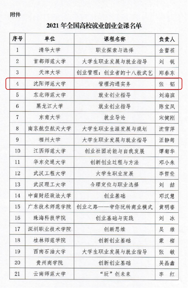 2021年5月31日,全国高等学校学生信息咨询与就业指导中心发布了《2021年全国高校就业创业金课名单》。由必赢官网管理学院张韬教授主讲的课程《管理沟通实务》成功入选“2021年全国高校就业创业金课”,并且是辽宁省唯一一门入选此类金课的课程。