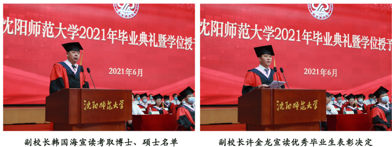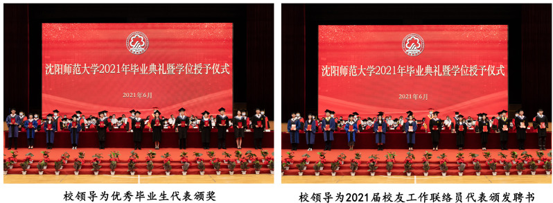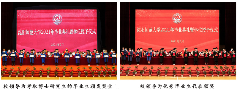 副校长韩国海宣读2021届考取博士、硕士研究生名单;副校长许金龙宣读省级、校级优秀毕业生表彰决定;主席台领导分别为考取博士研究生毕业生代表颁发奖金,为获得省级和校级优秀毕业生代表颁奖,并为2021届校友工作联络员代表颁发了聘书。