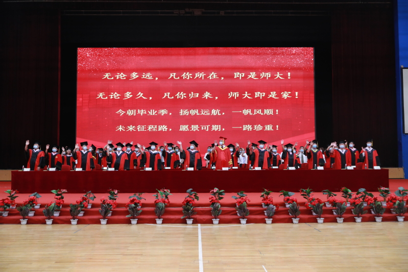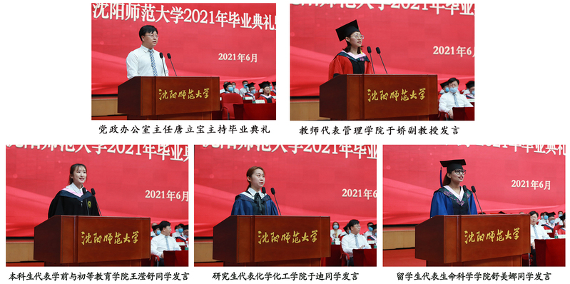 本科毕业生代表、学前与初等教育学院王滢舒,硕士毕业生代表、化学化工学院于迪,留学生毕业生代表、来自巴基斯坦的舒美娜分别上台发言。他们感恩母校的培育和师长的教导,他们表示将秉持“博学厚德、尚美健行”的校训和“自强不息、创业创新”的沈师精神,在未来的学习和工作中脚踏实地、不惧风雨、追求卓越,书写熠熠闪光的青春之歌。